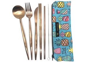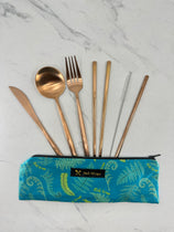 Each pouch is handmade with organic cotton. Inside is a set of stainless steel cutlery in rose gold color. Contains a fork, spoon, knife, set of chopsticks, straw and a straw cleaner.